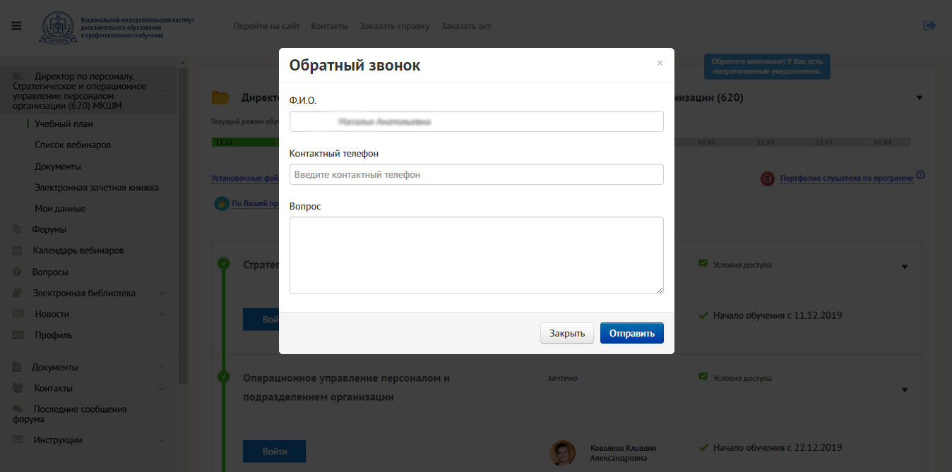 По поводу справок, документов и другим организационным вопросам вы можете связаться с отделом по организации учебного процесса. В разделе «Контакты» указана электронная почта и телефон куратора. При желании вы можете заказать обратный звонок.