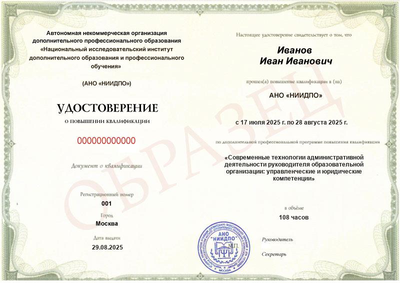 Современные технологии административной деятельности руководителя образовательной организации: управленческие и юридические компетенции (108ч)