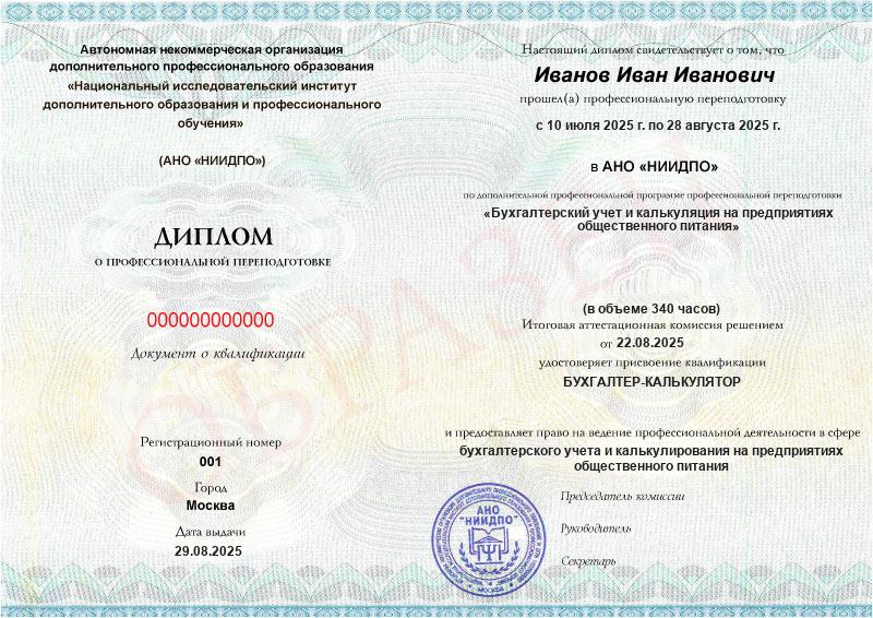 - Диплом с присвоением квалификации бухгалтера-калькулятора по программе дополнительного профессионального образования «Бухгалтерский учет и калькуляция на предприятиях общественного питания»