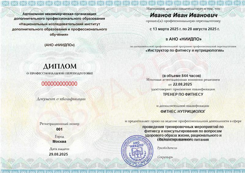 - Две квалификации в одном дипломе: «Тренер по фитнесу» и «Фитнес-нутрициолог»