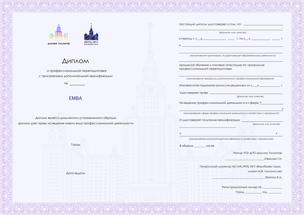 Два диплома: диплом установленного образца от «Долины Талантов» и диплом о профпереподготовке АНО «НИИДПО»