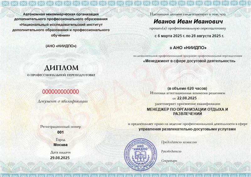 - Квалификация: Менеджер по организации отдыха и развлечений