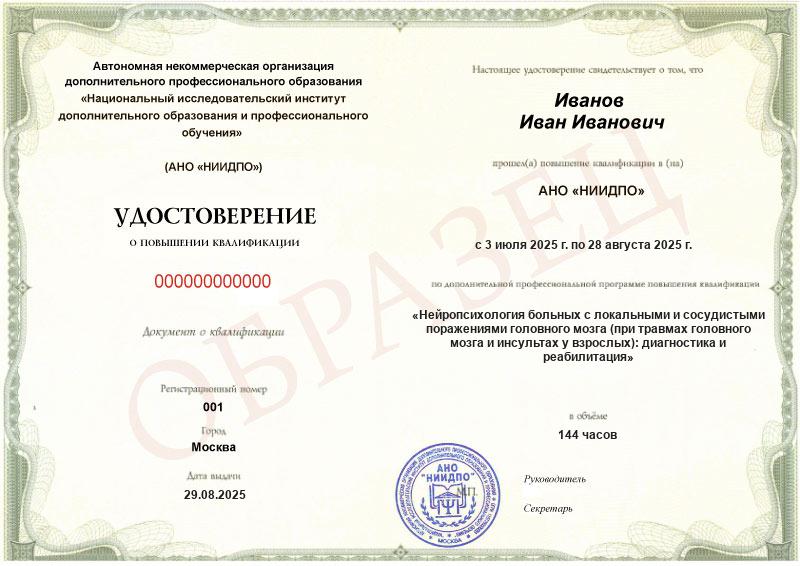 Нейропсихология больных с локальными и сосудистыми поражениями головного мозга (при травмах головного мозга и инсультах у взрослых): диагностика и реабилитация (144ч)