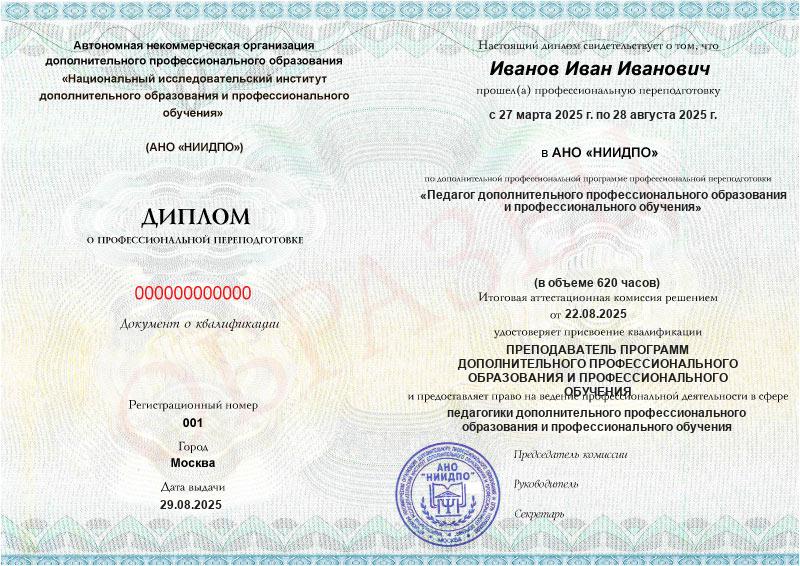Студент, желающий поступить в АНО «НИИДПО», должен предоставить справку из образовательной организации. Независимо от срока окончания обучения по программе дополнительного образования, диплом о профпереподготовке выдаётся только после предъявления документа о получении среднего профессионального или высшего образования.