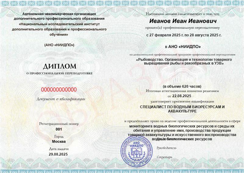 - Квалификация: Специалист по водным биоресурсам и аквакультуре