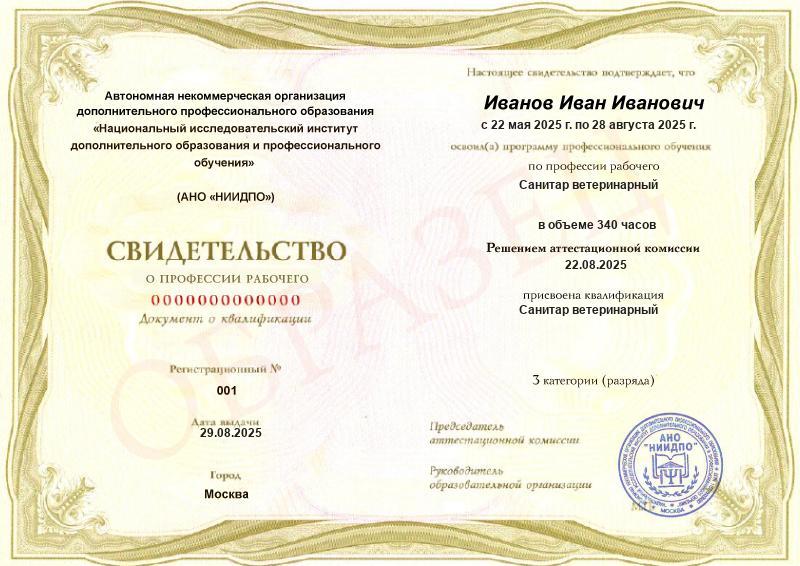 - Квалификация: Санитар ветеринарный