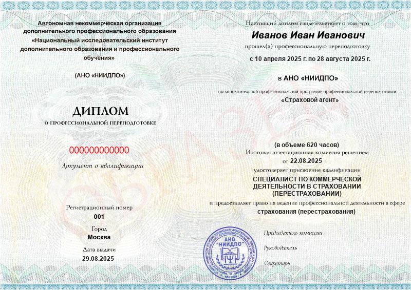 • Квалификация: Специалист по коммерческой деятельности в страховании (перестраховании)