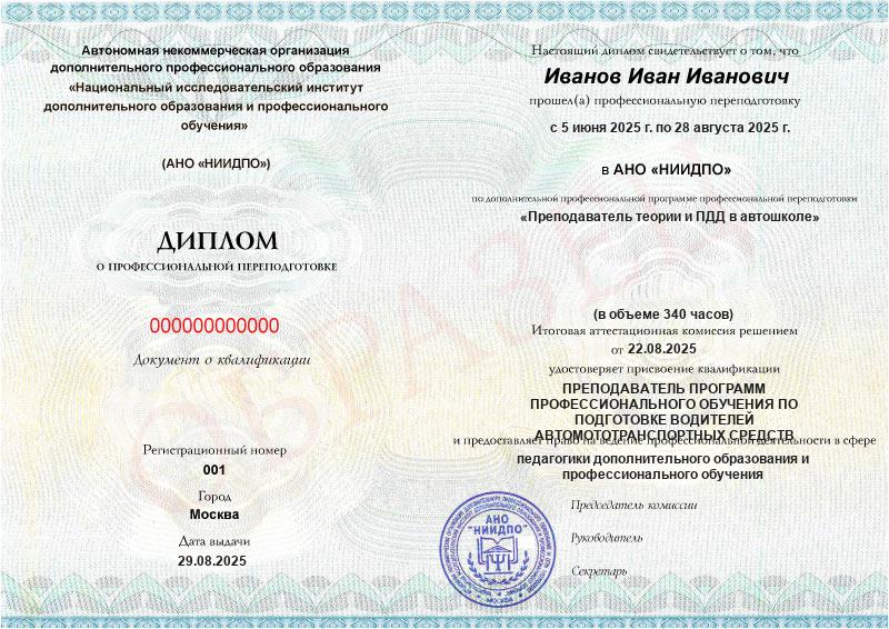 - Квалификация: Преподаватель программ профессионального обучения по подготовке водителей автомототранспортных средств