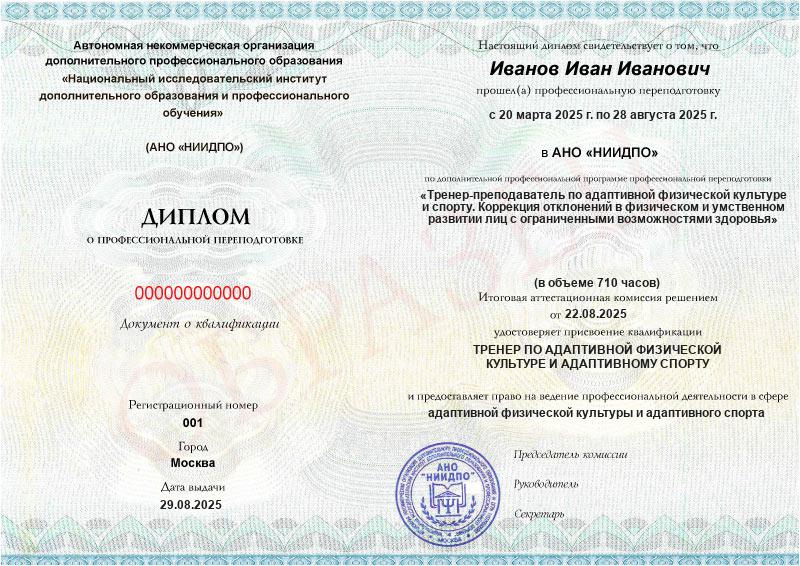 • Квалификация: Тренер по адаптивной физической культуре и адаптивному спорту