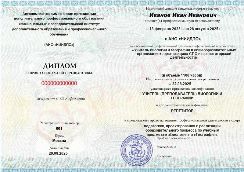 - 2 квалификации: Учитель (преподаватель) биологии и географии + Репетитор