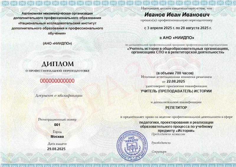 - 2 квалификации: Учитель (преподаватель) истории + Репетитор