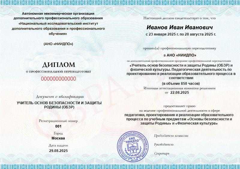 Учитель основ безопасности и защиты Родины (ОБЗР) и физической культуры. Педагогическая деятельность по проектированию и реализации образовательного процесса в соответствии с ФГОС (850ч)