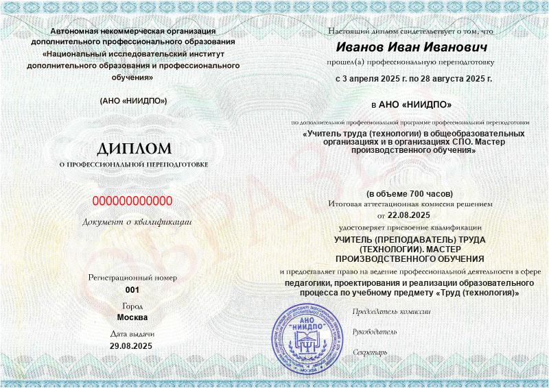 Учитель труда (технологии) в общеобразовательных организациях и в организациях СПО. Мастер производственного обучения (700ч)